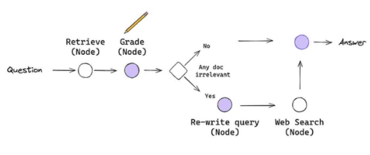 - 검색된 문서를 평가하고, 관련성이 낮은 문서는 시정 조치